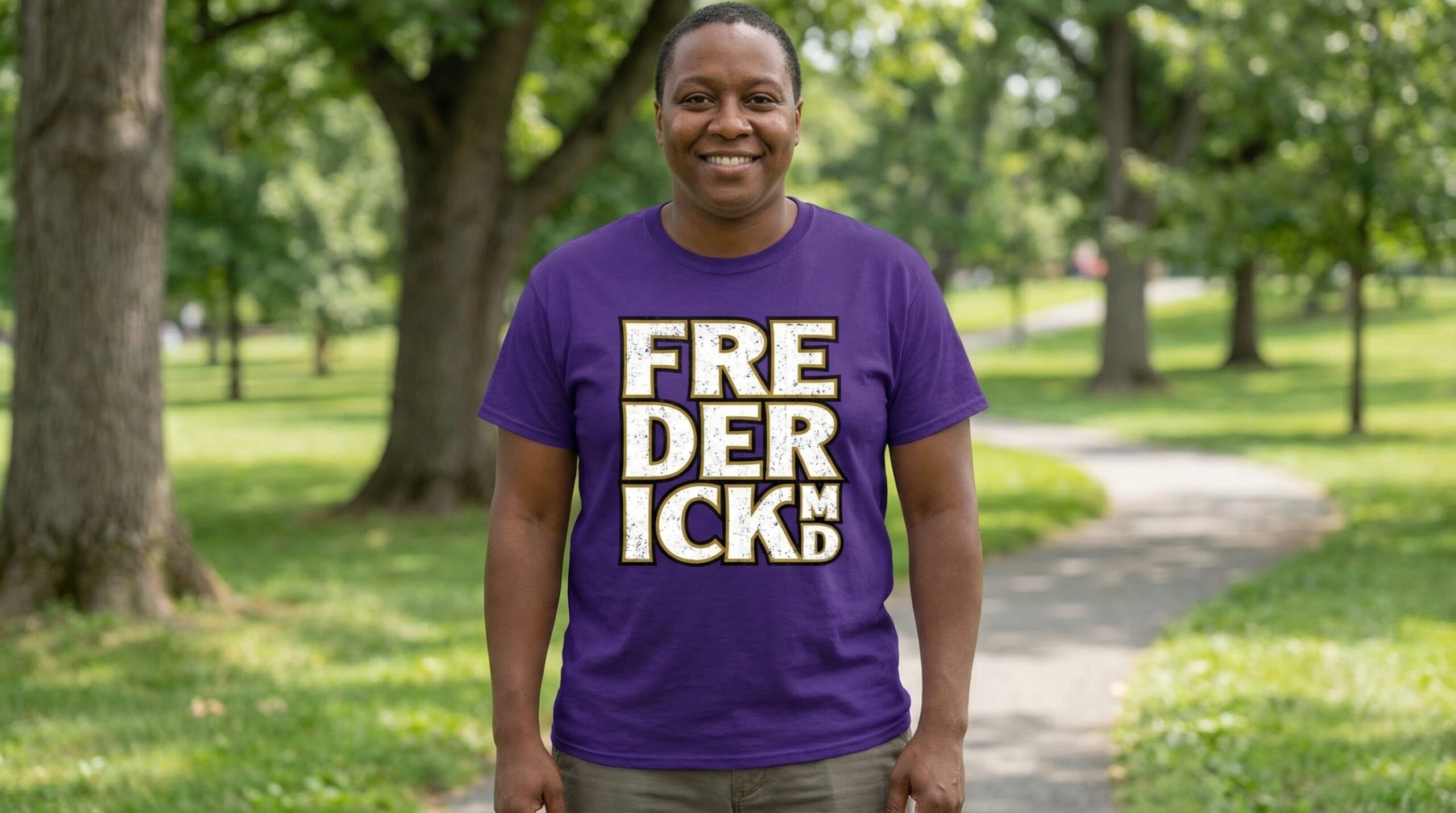 The Frederick Bold Purple & White Edition tee features stacked block lettering in crisp white with strong contrast against a rich purple backdrop. It’s athletic, confident, and made to stand out — whether you’re downtown, in the park, or showing hometown pride anywhere in Maryland.