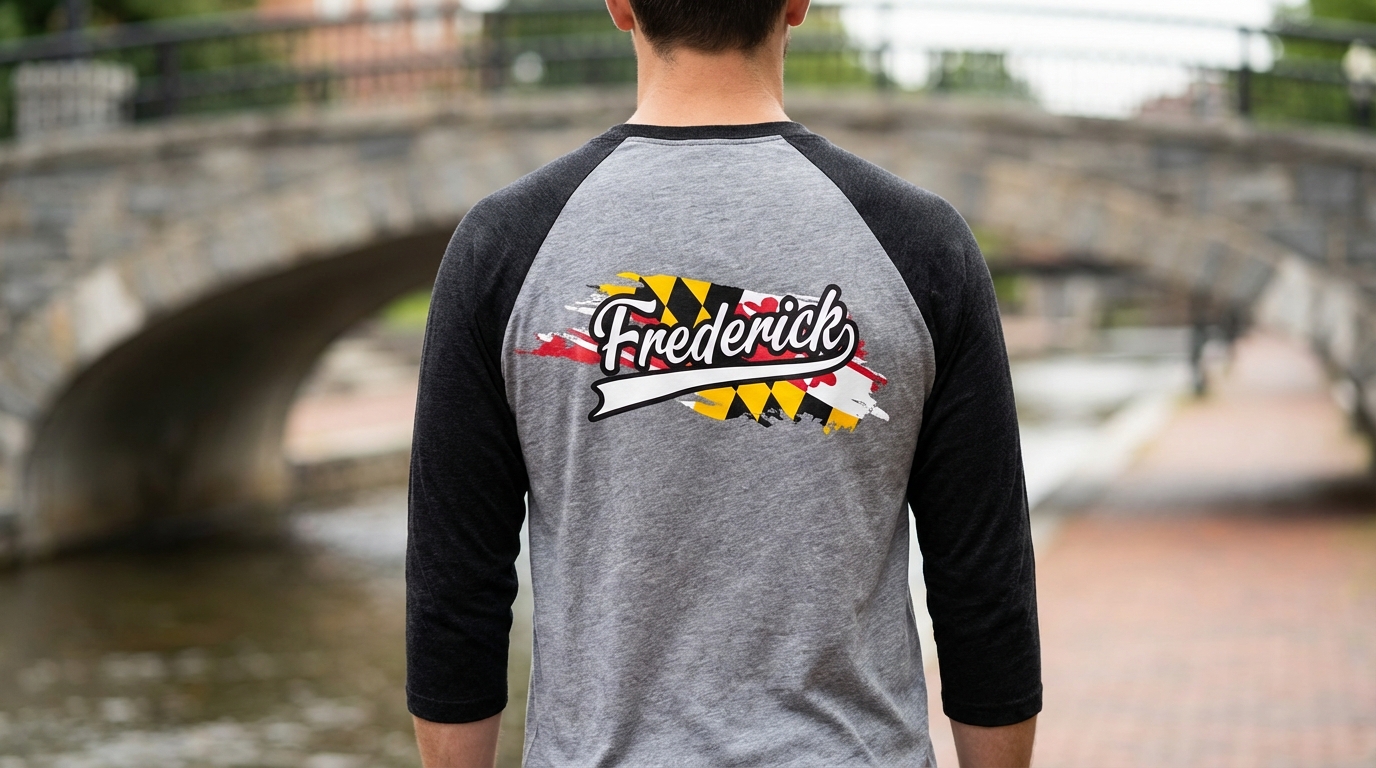 Featuring a subtle Frederick script on the front chest and a bold full-back Frederick graphic layered over Maryland flag elements, this design makes a statement from every angle.