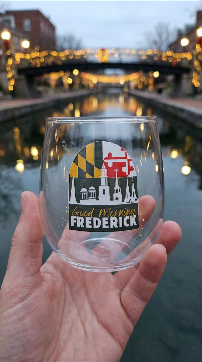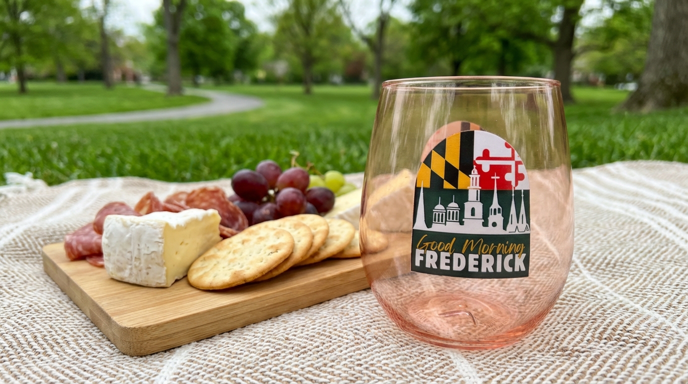 This 14 oz reusable wine tumbler features the Good Morning Frederick skyline logo set against Maryland-inspired colors — all on a soft rose-tinted plastic cup that’s perfect for outdoor gatherings.