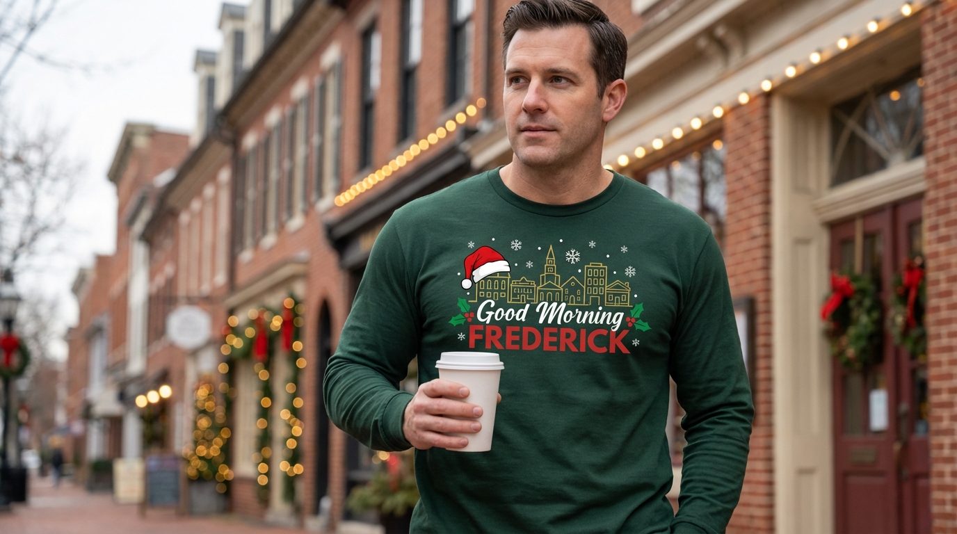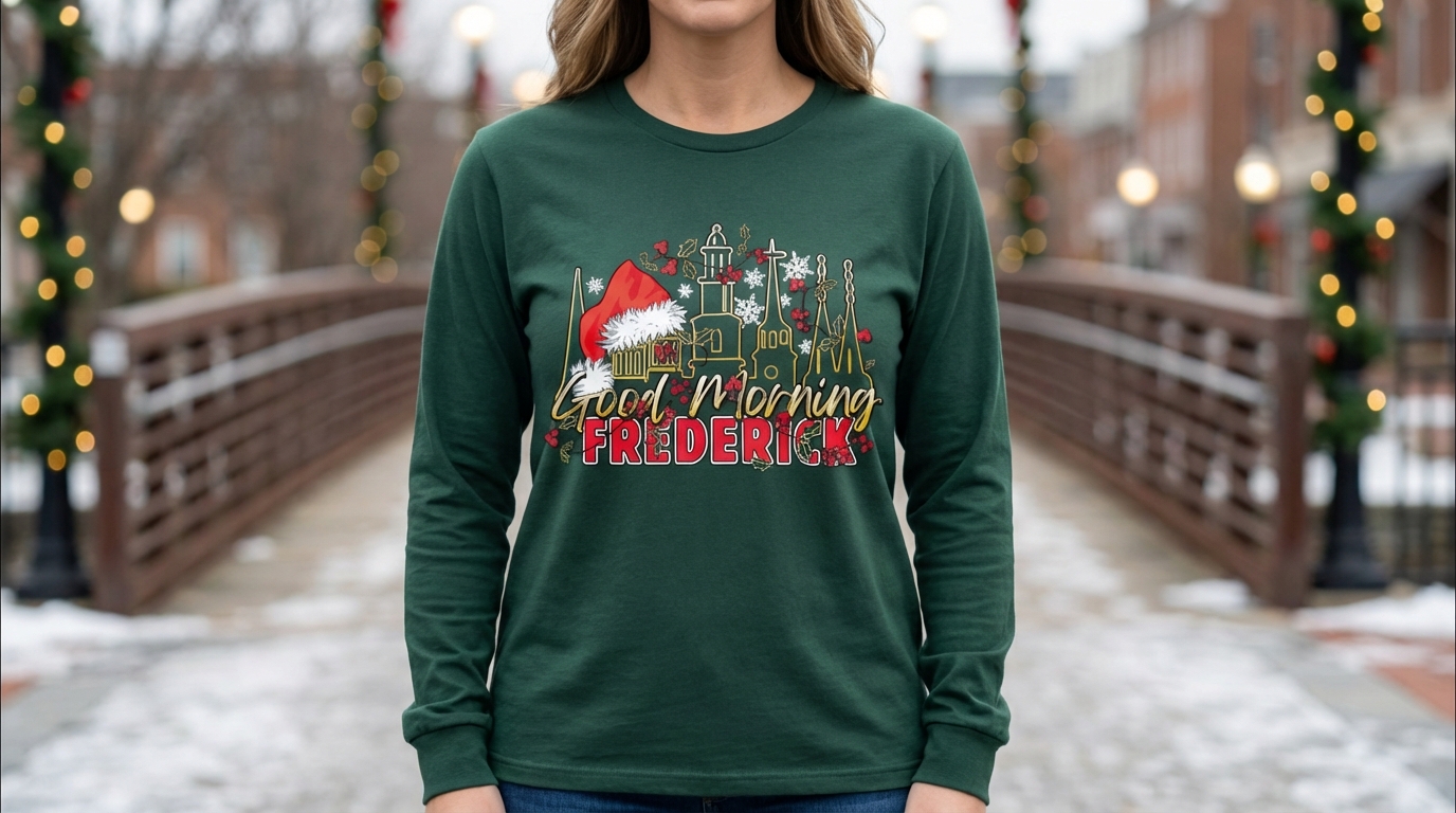 This limited-edition Holiday Long Sleeve Tee celebrates the season with a festive Good Morning Frederick skyline design featuring winter details, holiday accents, and a cozy seasonal vibe.