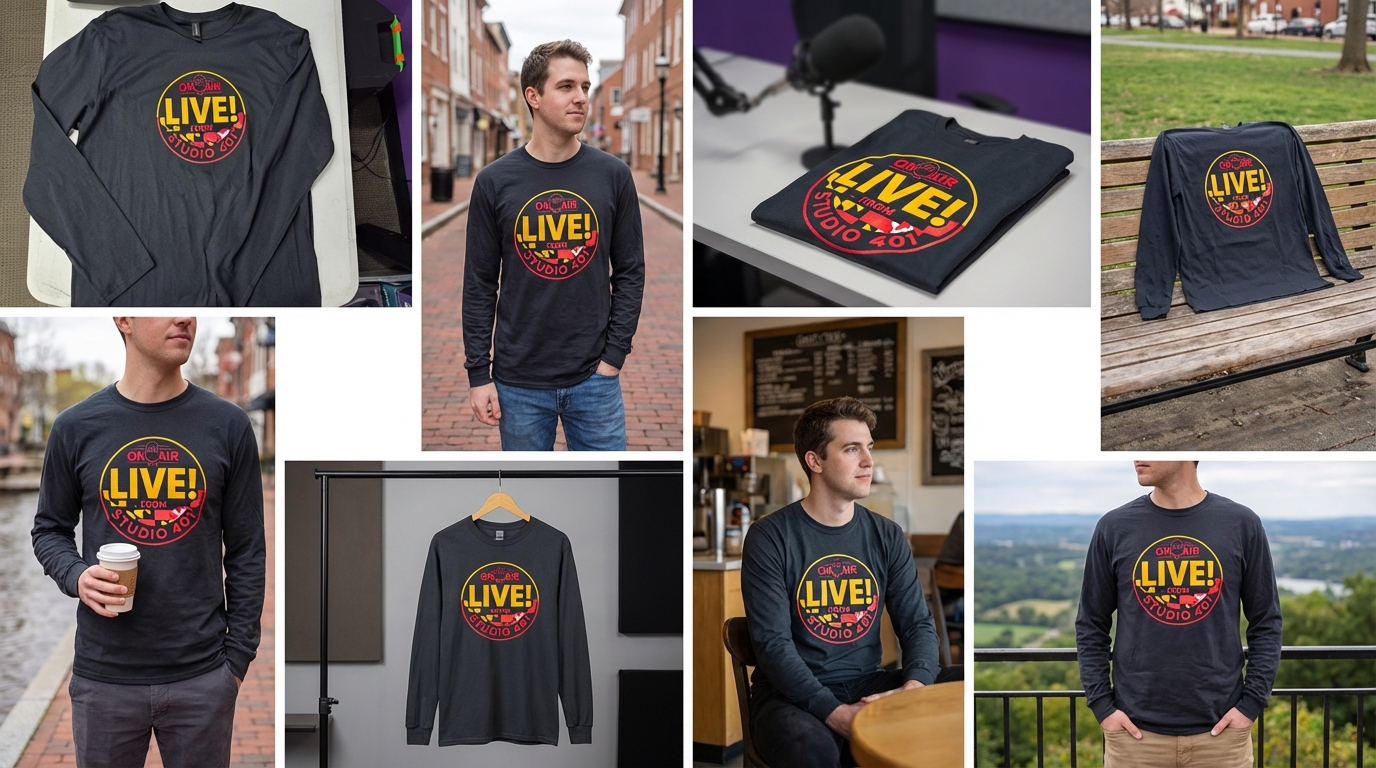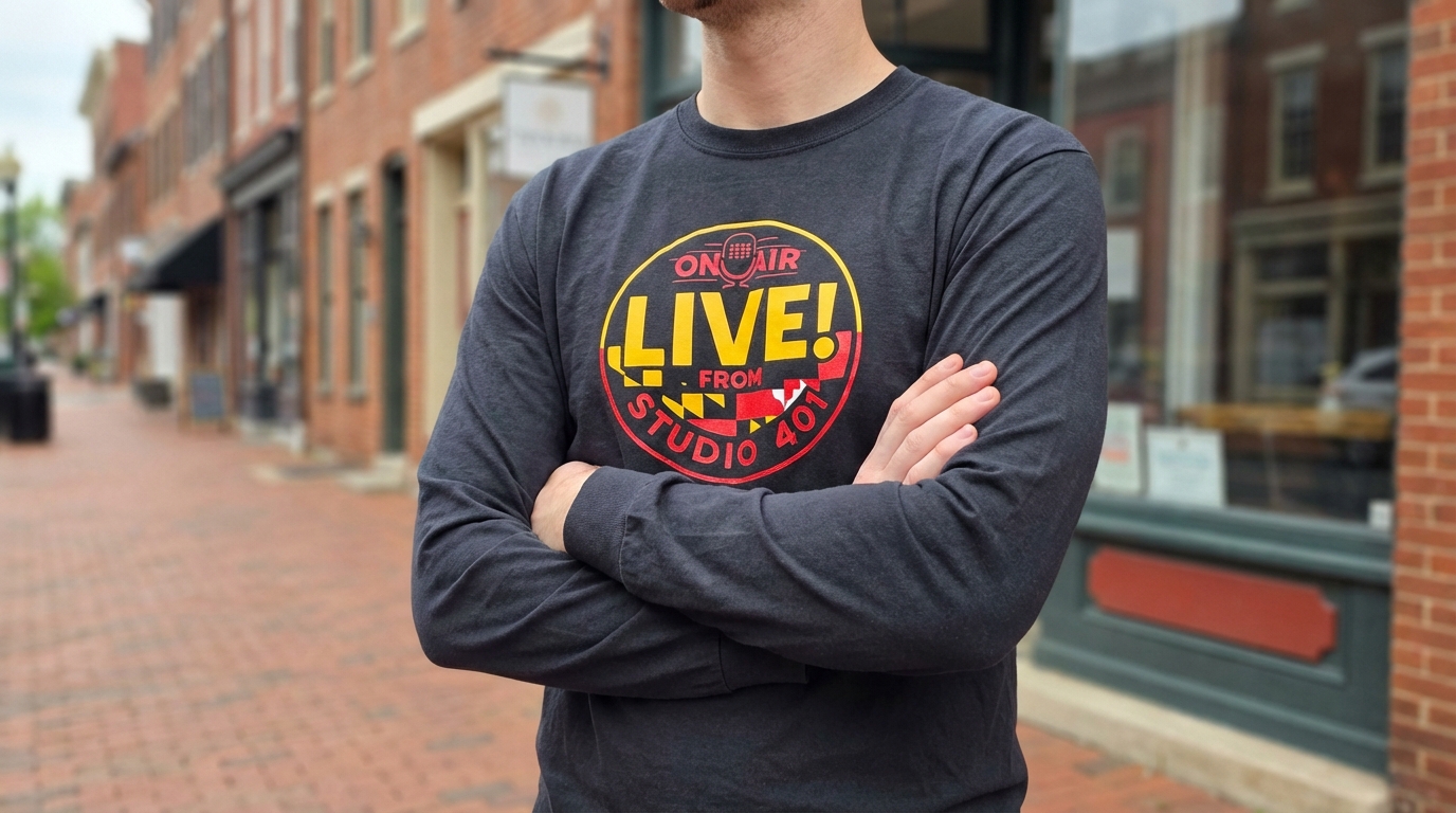 The official Live From Studio 401 long sleeve tee brings bold broadcast energy into cooler weather. Featuring the signature circular Studio 401 badge with Maryland-inspired details and on-air microphone iconography, this design makes a statement front and center.